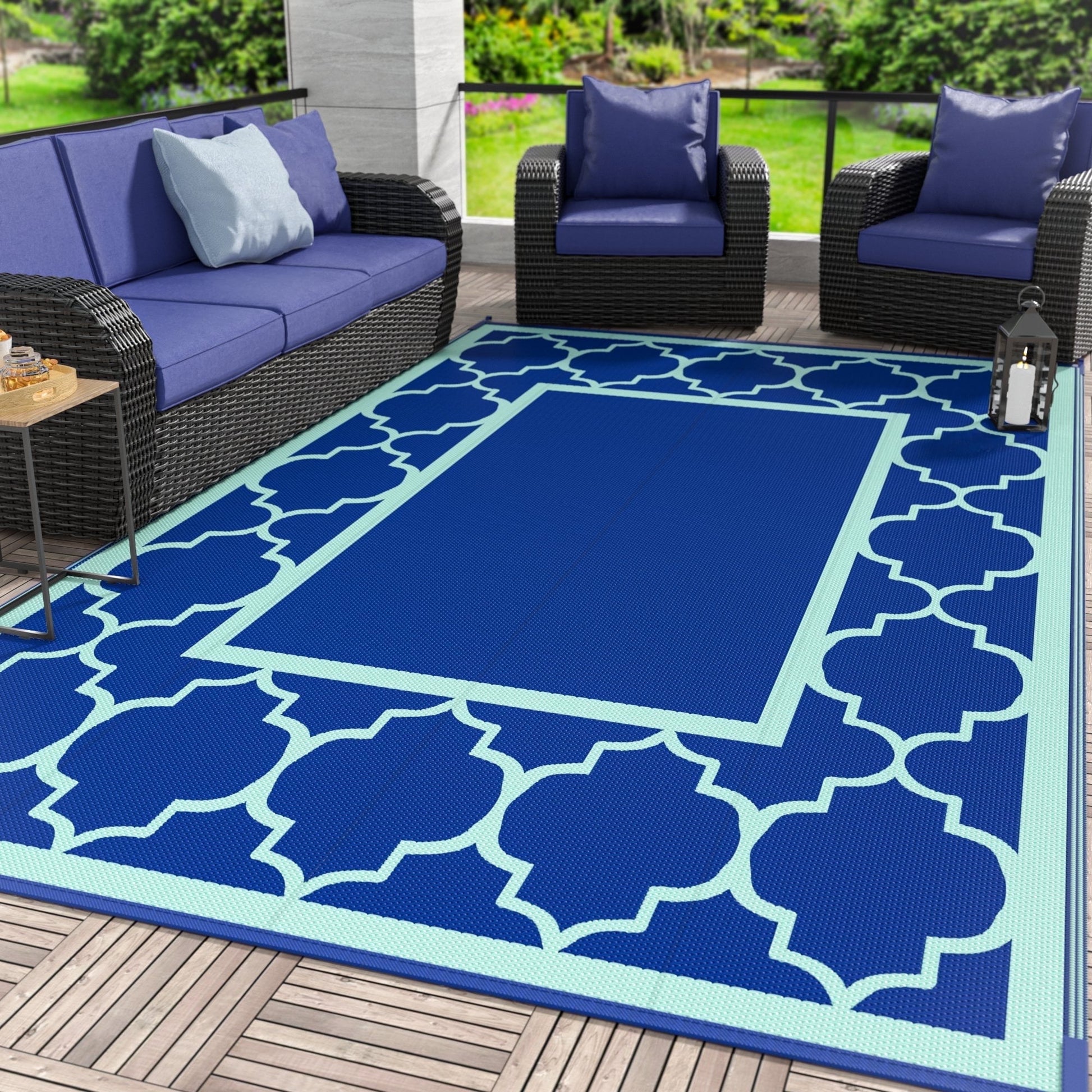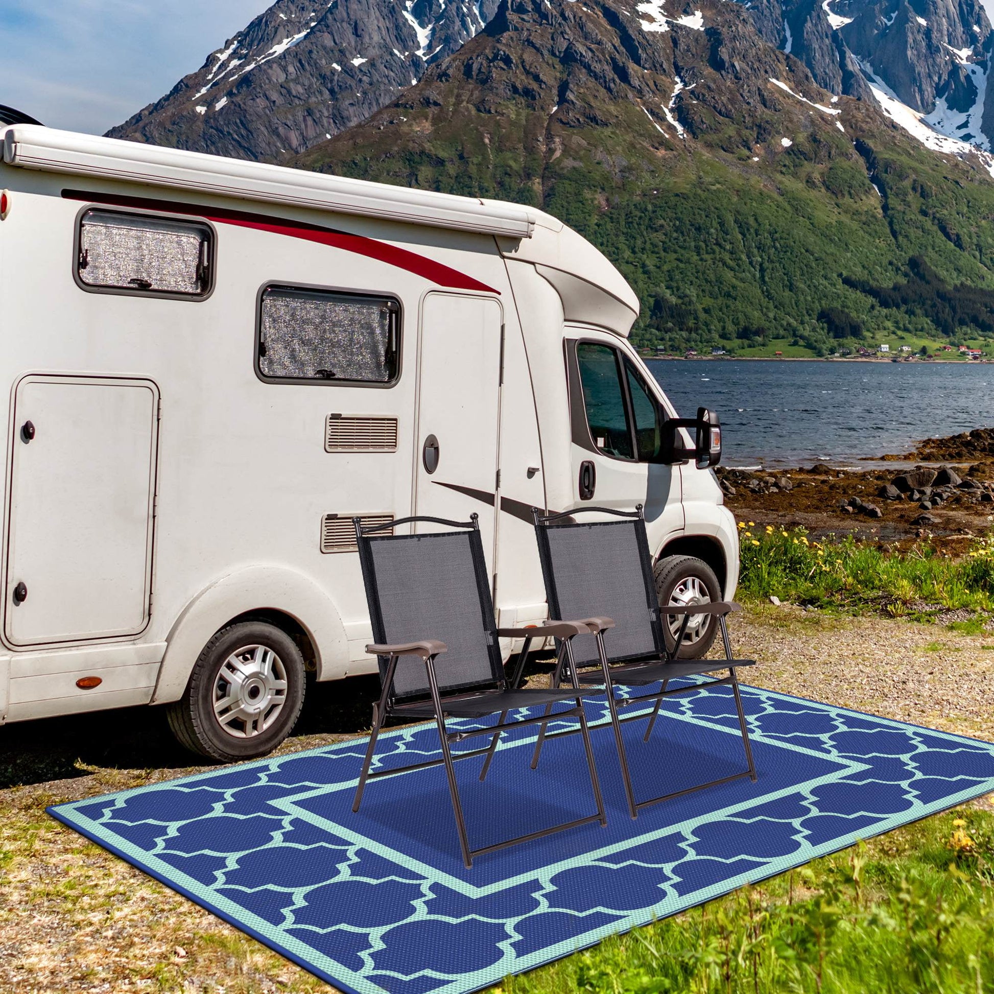 Size: 5x8 FT 【HIGH QUALITY & soft】The outdoor rug is made of 100% polypropylene, which is very soft, avoid harm your kids's skin, plants or deck. To make it more durable, soft and low-maintenance, all Our outdoor rugs are made of tightly woven plastic with heat-treated edges. You can use them freely any time and is more durable. 【WATERPROOF & EASY CLEANING】The outdoor rugs are water proof and easy to clean. Our outdoor rugs resist lots of stains: milk, wine, cola, grass and more. Simply sweep away dirt with water and the breathable design make it possible to airing dry in few minutes. If you are outside without water, you can just wipe it with cleaning cloth or shake it, rid the dust off. Great for keeping dogs out of the dirt. 【PORTABLE & FOLDABLE 】To meet the needs of outdoor activities, our outdoor camping rugs are light weight. And the reversible camping carpet are added seams for easily folding. Apart from that, every outside rug has 4 stakes for pressing outdoor mat on ground which make sure your outdoor rugs keep stable in windy day.And it comes with a carrying bag for added convenience. Durable Oxford cloth storage bag, and the transparent design on one side can show the beautiful color of the patio rugs. 【UV PROTECTED & FADE-RESIST】 UV coated design totally prevents the damages from ultraviolet and high temperature. And this coat also makes it anti-fading overtime.But do not leave in direct sunlight for extended periods, use it in the shade to make the camping rug more durable. PS: The color may be different in the sun. 【MULTI-FUNCTIONAL USE & CUSTOMER SERVICE】This carpet which stands up to all seasons is a great option to create an outdoor oasis for patio, RV camping, porch, deck, playground, beach, balcony, picnic, gardens and garages.You and your family can walk, relax and play on the carpet without fear of allergies. If you got any problem with our product, please contact us immediately, we will offer you a satisfactory solution.