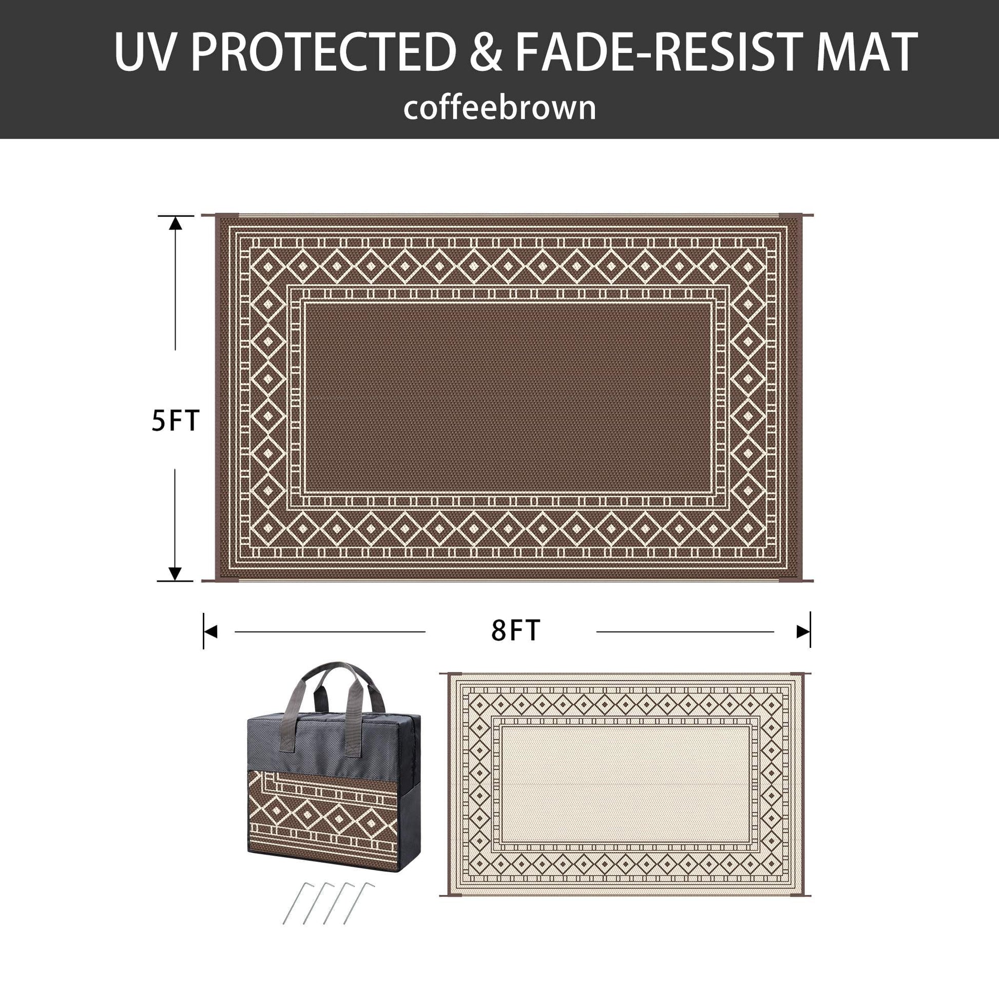 Material : Plastic ; Size : 5 x 8 FT 【ELEGANT & VERSATILE STYLE】The DEORAB outdoor rug features a clean geometric pattern with classic pastel colors, bringing a refined, modern look to any outdoor space. Whether it's for sunny afternoons in the backyard or weekend adventures, it’s the perfect blend of style and function. 【REVERSIBLE & PORTABLE】Designed for flexibility, the patio rug is fully reversible—offering two distinct looks in one. It folds easily and comes with a matching carry bag for effortless transport. Four included ground stakes help keep it firmly in place, making it ideal for camping, beach days, or picnics. 【WATERPROOF & LOW MAINTENANCE】Crafted from waterproof lightweight plastic straw, the outdoor carpet is resistant to common outdoor stains like wine, milk, grass, dust and soda. Simply rinse with water, shake it clean, or wipe with a cloth when needed. Its breathable texture allows for quick air-drying. 【UV-PROTECTED】UV coating helps protect the camping rug from sun damage and fading, keeping its colors vibrant over time. For extended durability, we advise against prolonged exposure to the sun. Colors may vary slightly under strong sunlight. 【VERSATILE & DURABILITY】Soft yet tough, this rug is safe for grass and gentle on feet. Perfect for patios, RVs, gardens, balconies, and more. It’s a family- and pet-friendly choice to relax and play. Note: Some creases may appear due to folding—these are normal and will fade with use. You can place heavy objects to help smooth them faster.
