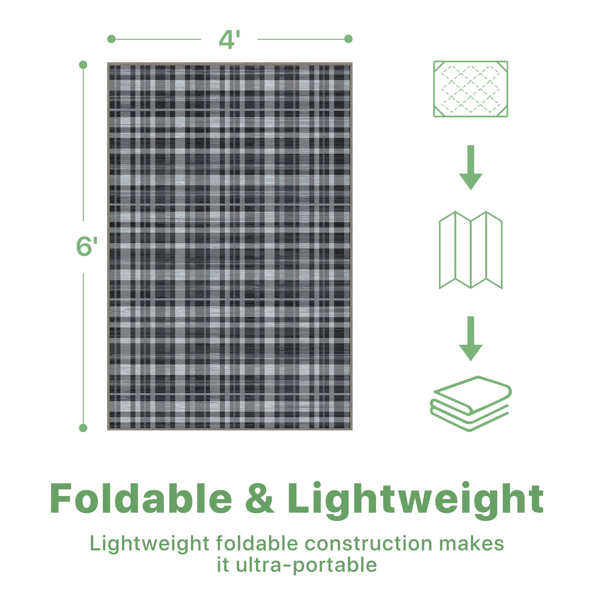 Material: Polyester Color: black Size: 4x6 FT 【EASY CLEARING】The low pile outdoor rug is stain resistant, simply toss it in the machine for a quick wash, and line dry or dry on an air-only cycle without heat. We recommend line drying or drying without heat on an air-only dryer cycle. A low heat iron can be used if needed. 【NON-SLIP BACKING】Our patio rug non-slip backing is molded with faux silicone spot molding, which is great for enhancing the friction between the mat and the ground or deck floor. It enhances the anti-slip without damaging the lawn and deck. It can be well used in a variety of outdoor scenarios. 【SAFE & DURABLE】DEORAB outdoor carpet is made of cozy chenille material,featuring a beautiful appearance,while it won't shed and easy to clean.And there is no need to worry about pet's paws scratch or get hooked on chenille outdoor rug. 【UV RESISTANT】Our outdoor rug ensures durability and long-lasting beauty when placed in any high traffic areas. This area rug is UV-resistant, durable and perfect for outdoor use. 【VERSATILE USE】Ideal for picnics, barbecues, or simply lounging outside, this outdoor rug adds comfort and style to any outdoor gathering, making it a must-have addition to your patio decor.This camping rug is heavy enough that it won't be easily blown away by the breeze.
