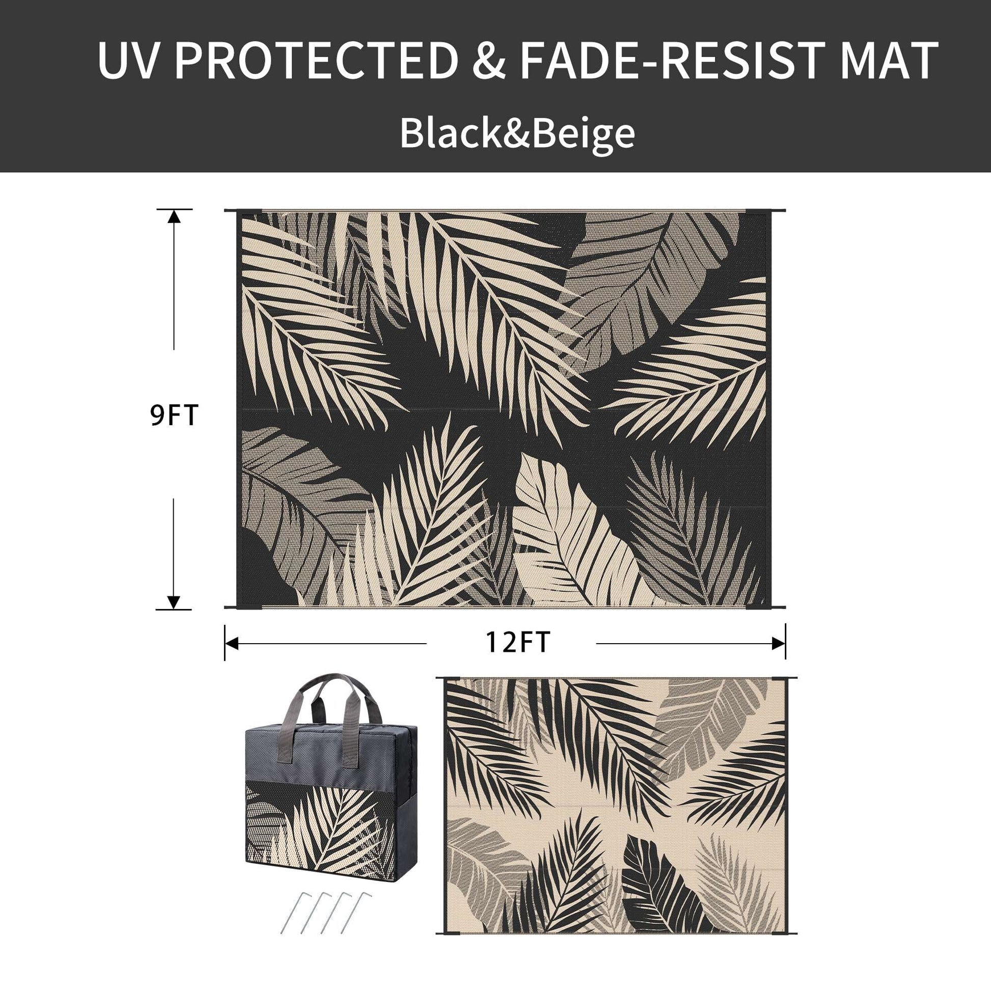 Material : Plastic ; Size : 9 x 12 FT 【REVERSIBLE DESIGN】Add a touch of natural elegance to any outdoor setting with the DEORAB outdoor rug, featuring a graceful leafy pattern and a fully reversible design for versatile styling. Thoughtfully finished with reinforcement of edges and secure corner rings, it includes four ground stakes to keep the rug in place—perfect for breezy afternoons or busy outdoor gatherings. 【EASY TO CLEAN】Woven from eco-friendly recycled plastic, this outdoor carpet is both durable and low-maintenance. Its tightly woven texture allows water to drain quickly, while its moisture-resistant and stain-repellent surface means spills, splashes, and weather are no concern. 【PORTABLE & FOLDABLE】Designed with portability in mind, the patio rug folds down easily and comes with a convenient carry bag. Whether you’re headed to the beach, on a picnic, camping, or simply relaxing in your backyard, it’s the perfect companion for outdoor comfort and style. 【UV PROTECTION】Equipped with UV protection, the camping rug resists fading and damage from the sun's rays, preserving its vibrant colors and integrity throughout the season. Enjoy its beauty and durability under the sun, knowing it will remain as stunning as ever. 【SOFT & DURABLE】Soft underfoot with reinforced edges to prevent fraying, waterproof plastic carpet is breathable and gentle on grass. Note: Folding may cause slight creases—harmless and temporary. Placing heavy objects on top can help smooth them out more quickly.