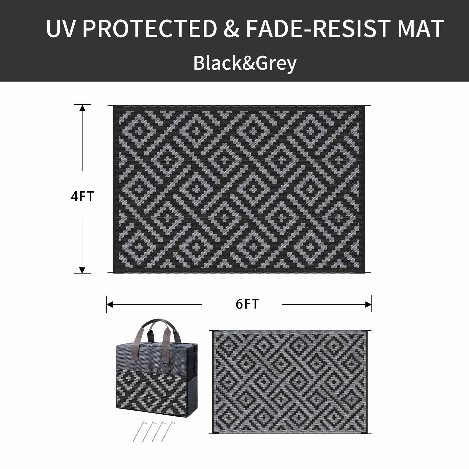 Material: Polyester Color: blackgray Size: 4x6 FT 【Stylish & Durable Design】 Our outdoor rugs are made from polyester with a tightly woven texture and heat-treated edges for enhanced strength. The classic geometric design and sturdy hemming combine style with function, perfect for any outdoor setting. 【Reversible, Portable & Fully Equipped】 Features a reversible two-tone design for added versatility. Lightweight, foldable, and easy to carry. Comes with a durable Oxford storage bag (with clear window) and 4 ground stakes to secure the rug in windy conditions. 【WATERPROOF & EASY CLEANING】The outdoor rugs are water proof and easy to clean. Our outdoor rugs resist lots of stains: milk, wine, cola, grass and more. Simply sweep away dirt with water and the breathable design make it possible to airing dry in few minutes. If you are outside without water, you can just wipe it with cleaning cloth or shake it, rid the dust off. Great for keeping dogs out of the dirt. 【UV PROTECTED & FADE-RESIST】 UV coated design totally prevents the damages from ultraviolet and high temperature. And this coat also makes it anti-fading overtime.But do not leave in direct sunlight for extended periods, use it in the shade to make the camping rug more durable. PS: The color may be different in the sun. 【OUTDOOR VERSATILITY & FOLDING NOTE】 Suitable for patios, RV camping, balconies, beaches, gardens, and more. Note: Slight creases from folding may appear upon opening but will flatten over time and do not affect performance.