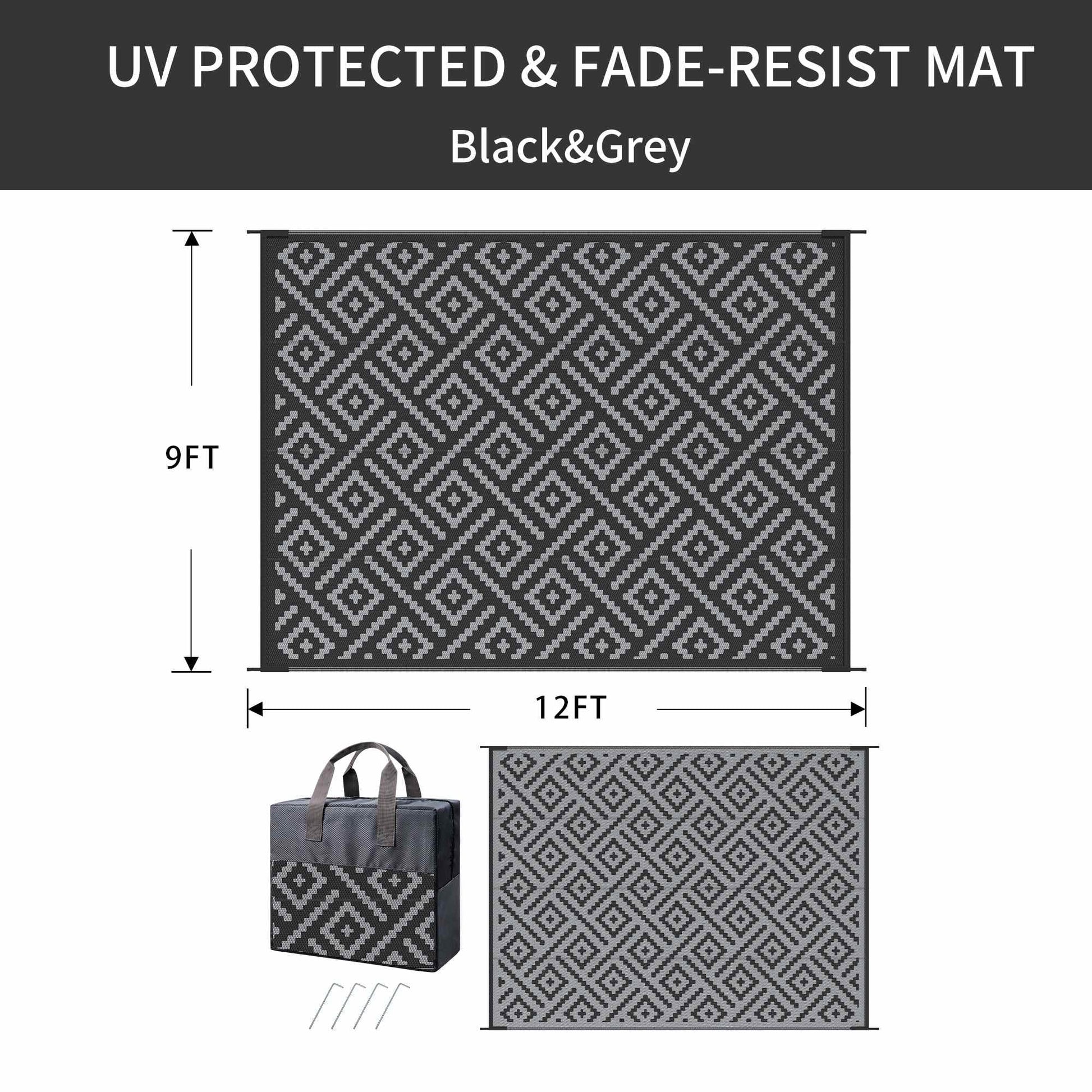 • Material: Polyester Color: blackgray Size: 9x12 FT 【Stylish & Durable Design】 Our outdoor rugs are made from polyester with a tightly woven texture and heat-treated edges for enhanced strength. The classic geometric design and sturdy hemming combine style with function, perfect for any outdoor setting. 【Reversible, Portable & Fully Equipped】 Features a reversible two-tone design for added versatility. Lightweight, foldable, and easy to carry. Comes with a durable Oxford storage bag (with clear window) and 4 ground stakes to secure the rug in windy conditions. 【WATERPROOF & EASY CLEANING】The outdoor rugs are water proof and easy to clean. Our outdoor rugs resist lots of stains: milk, wine, cola, grass and more. Simply sweep away dirt with water and the breathable design make it possible to airing dry in few minutes. If you are outside without water, you can just wipe it with cleaning cloth or shake it, rid the dust off. Great for keeping dogs out of the dirt. 【UV PROTECTED & FADE-RESIST】 UV coated design totally prevents the damages from ultraviolet and high temperature. And this coat also makes it anti-fading overtime.But do not leave in direct sunlight for extended periods, use it in the shade to make the camping rug more durable. PS: The color may be different in the sun. 【OUTDOOR VERSATILITY & FOLDING NOTE】 Suitable for patios, RV camping, balconies, beaches, gardens, and more. Note: Slight creases from folding may appear upon opening but will flatten over time and do not affect performance.