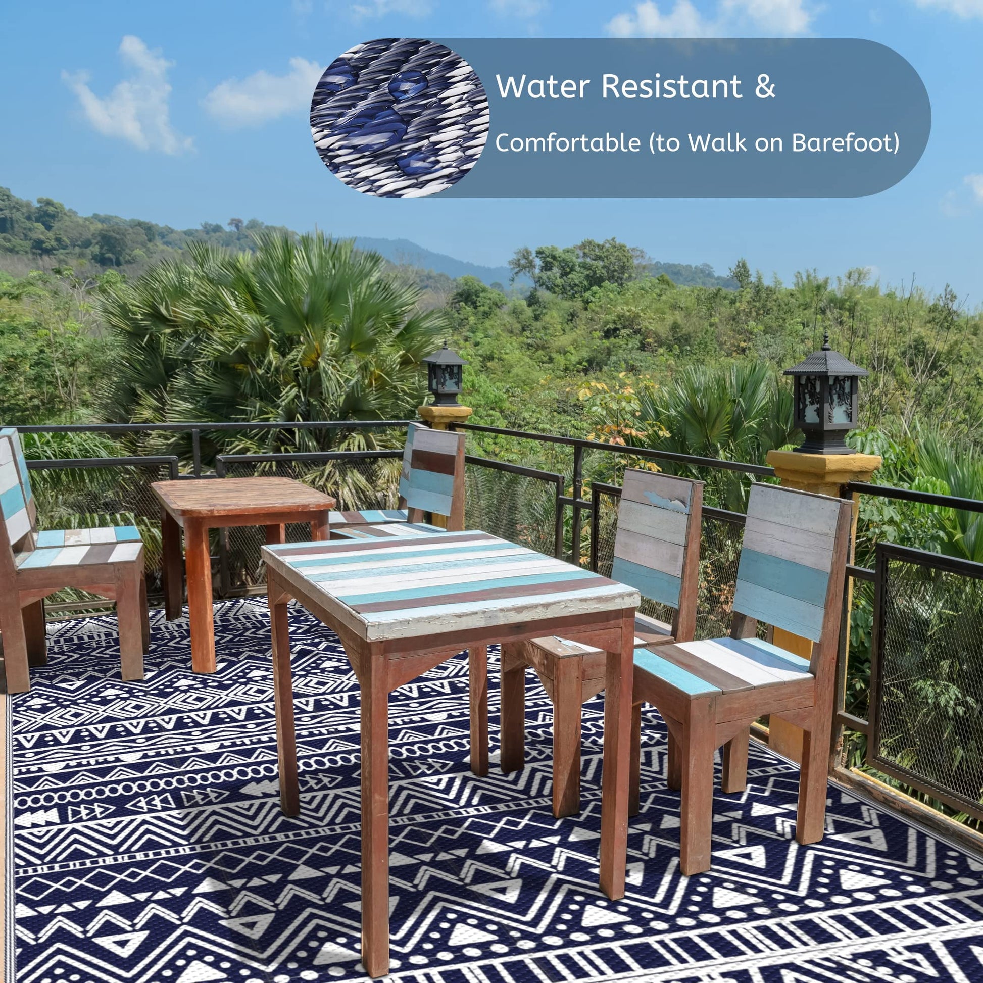 Material: Polyester Color: bluewhite Size: 9x12 FT 【Stylish & Durable Design】 Our outdoor rugs are made from polyester with a tightly woven texture and heat-treated edges for enhanced strength. The classic geometric design and sturdy hemming combine style with function, perfect for any outdoor setting. 【Reversible, Portable & Fully Equipped】 Features a reversible two-tone design for added versatility. Lightweight, foldable, and easy to carry. Comes with a durable Oxford storage bag (with clear window) and 4 ground stakes to secure the rug in windy conditions. 【WATERPROOF & EASY CLEANING】The outdoor rugs are water proof and easy to clean. Our outdoor rugs resist lots of stains: milk, wine, cola, grass and more. Simply sweep away dirt with water and the breathable design make it possible to airing dry in few minutes. If you are outside without water, you can just wipe it with cleaning cloth or shake it, rid the dust off. Great for keeping dogs out of the dirt. 【UV PROTECTED & FADE-RESIST】 UV coated design totally prevents the damages from ultraviolet and high temperature. And this coat also makes it anti-fading overtime.But do not leave in direct sunlight for extended periods, use it in the shade to make the camping rug more durable. PS: The color may be different in the sun. 【OUTDOOR VERSATILITY & FOLDING NOTE】 Suitable for patios, RV camping, balconies, beaches, gardens, and more. Note: Slight creases from folding may appear upon opening but will flatten over time and do not affect performance.