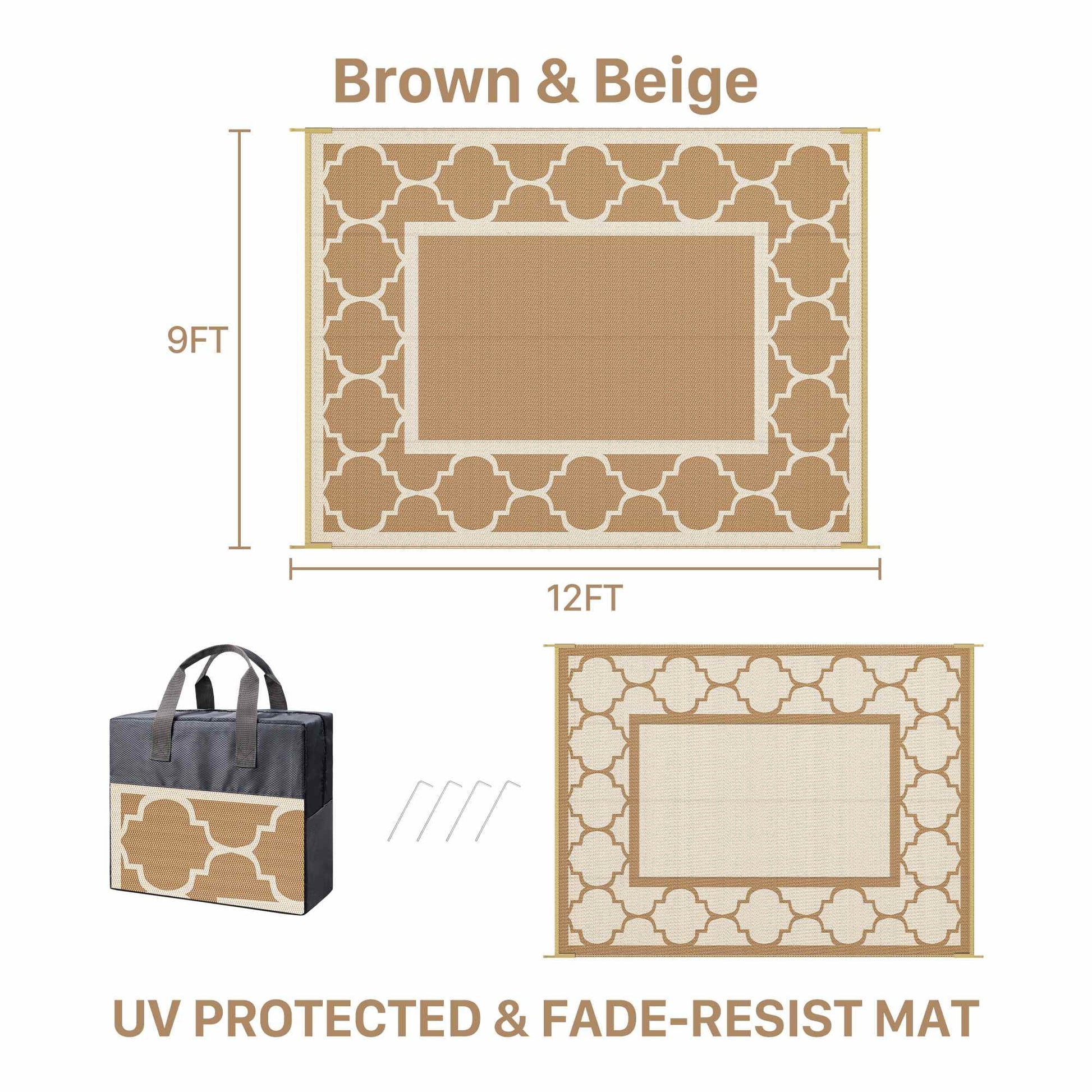 Material: Polyester Color: brownbeige Size: 9x12 FT 【Stylish & Durable Design】 Our outdoor rugs are made from polyester with a tightly woven texture and heat-treated edges for enhanced strength. The classic geometric design and sturdy hemming combine style with function, perfect for any outdoor setting. 【Reversible, Portable & Fully Equipped】 Features a reversible two-tone design for added versatility. Lightweight, foldable, and easy to carry. Comes with a durable Oxford storage bag (with clear window) and 4 ground stakes to secure the rug in windy conditions. 【WATERPROOF & EASY CLEANING】The outdoor rugs are water proof and easy to clean. Our outdoor rugs resist lots of stains: milk, wine, cola, grass and more. Simply sweep away dirt with water and the breathable design make it possible to airing dry in few minutes. If you are outside without water, you can just wipe it with cleaning cloth or shake it, rid the dust off. Great for keeping dogs out of the dirt. 【UV PROTECTED & FADE-RESIST】 UV coated design totally prevents the damages from ultraviolet and high temperature. And this coat also makes it anti-fading overtime.But do not leave in direct sunlight for extended periods, use it in the shade to make the camping rug more durable. PS: The color may be different in the sun. 【OUTDOOR VERSATILITY & FOLDING NOTE】 Suitable for patios, RV camping, balconies, beaches, gardens, and more. Note: Slight creases from folding may appear upon opening but will flatten over time and do not affect performance.