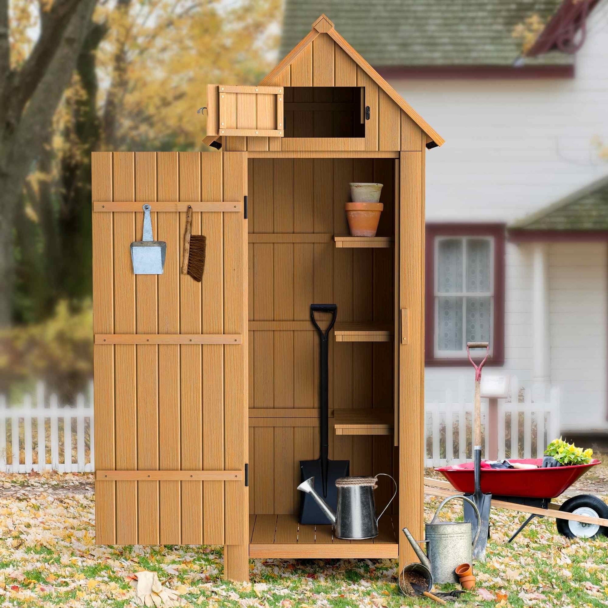 Material: Wood Color: Wood Height: 70.5" Width: 25.6" Depth: 18.1" *This waterproof wooden cabinet serves multiple functions, including a utility cabinet, garden shed, and pool supplies cabinet. The lockable door keeps your tools secure and organized *Made of high-quality fir wood with a raised bottom for stability and durability. Features 4 metal supports for enhanced security and easy integration with your outdoor decor *The pitched asphalt roof design and waterproof coating protect against adverse weather conditions, extending the shed's lifespan outdoors *Equipped with 3 levels of movable shelves, providing ample storage for tools and keeping your space tidy. Easily adjust the shelves to accommodate larger items *Easy to Assemble: Comes with detailed instructions and necessary hardware to simplify installation. All parts are clearly marked for your convenience